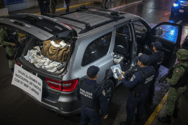 Elementos de la Secretaría de Seguridad del Estado de México y de la Defensa Nacional detuvieron a dos sujetos que circulaban sobre la avenida Lomas Verdes, a la altura de la colonia Lomas Verdes, en el municipio de Naucalpan, en portación de 37 millones de pesos en efectivo cuya posesión no pudieron comprobar y un par de armas de fuego de calibre no especificado. La detención de…